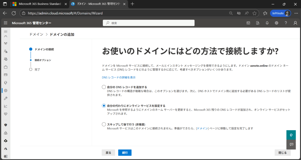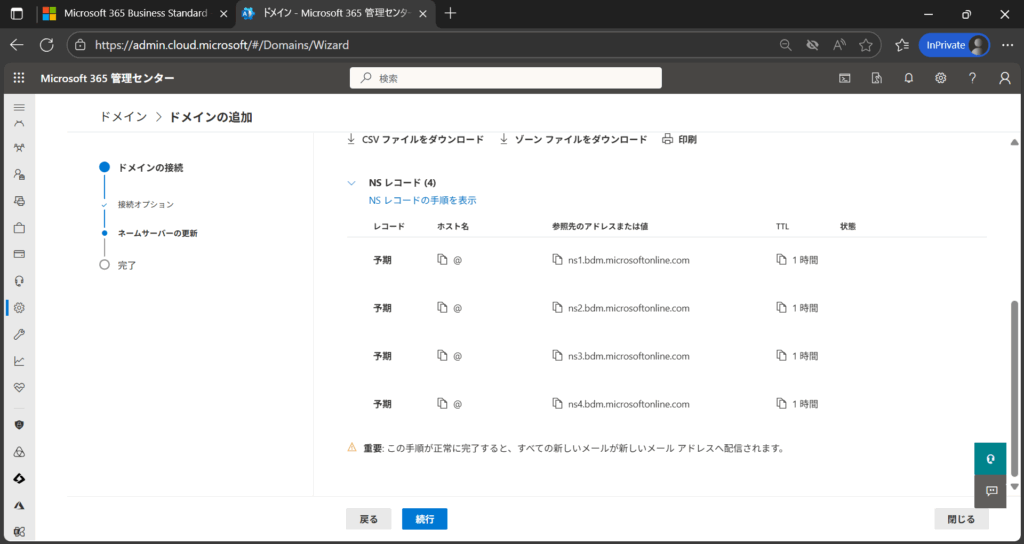 - お名前ドットコムでネームサーバの設定変更が完了したら、365の管理コンソールに戻り、続行を選択する。