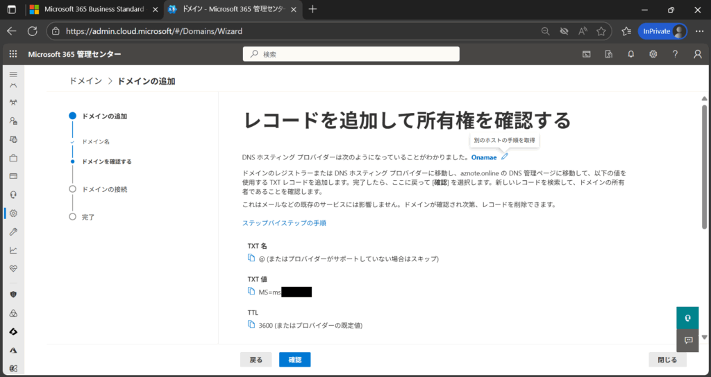 Step 1:M365でTXT値を取得(所有確認のコード)