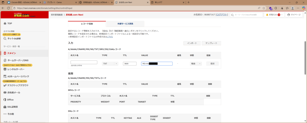 | TXT | @ | MS=msXXXXXXXX(管理センター表示の値で置換) | 3600 | 所有確認用。SPFとは別レコード |