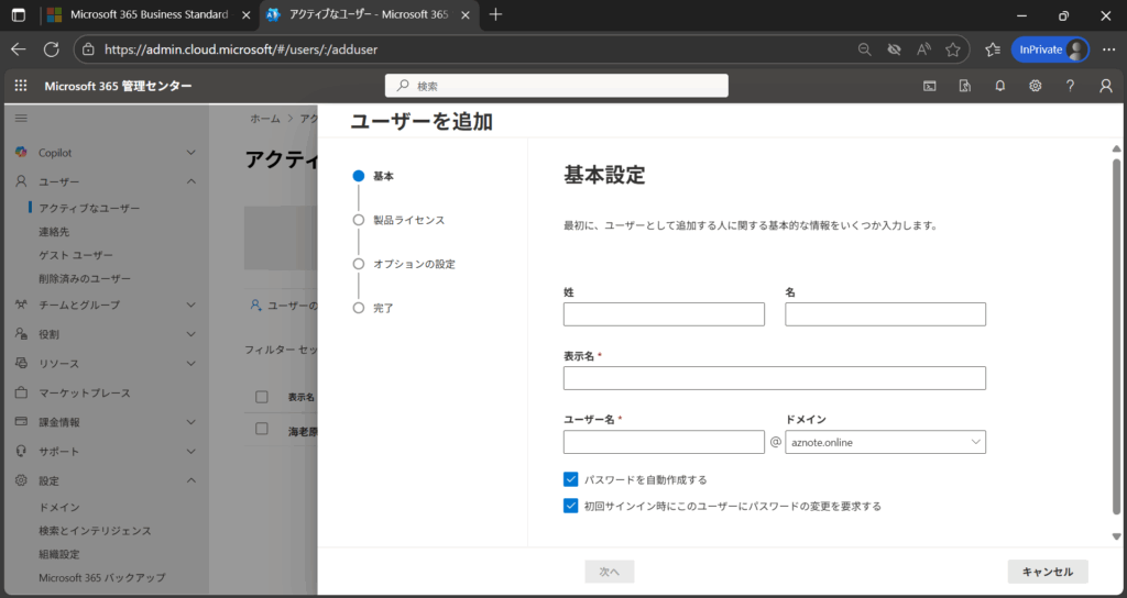 ※ 既定ドメイン切替前でも、プルダウンから@aznote.onlineを選べます(切替後は自動で @aznote.online が既定になります)。 - パスワード設定(初回変更を要求にチェック推奨)。